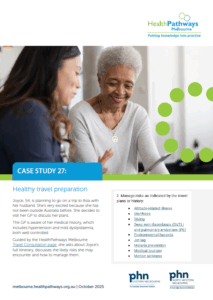 The GP is aware of her medical history, which includes hypertension and mild dyslipidaemia, both well controlled. Guided by the HealthPathways Melbourne Travel Consultation page, she asks about Joyce’s full itinerary, discusses the likely risks she may encounter and how to manage them.