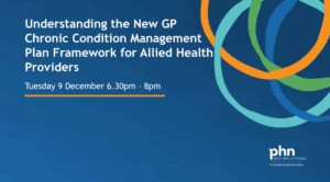 Facilitated by Western Victoria Primary Health Network, the session covers the new GP Chronic Condition Management Plan (GPCCMP) framework, updates to referral processes, what GPs are doing differently and how this impacts allied health practice, as well as transition arrangements and billing implications.