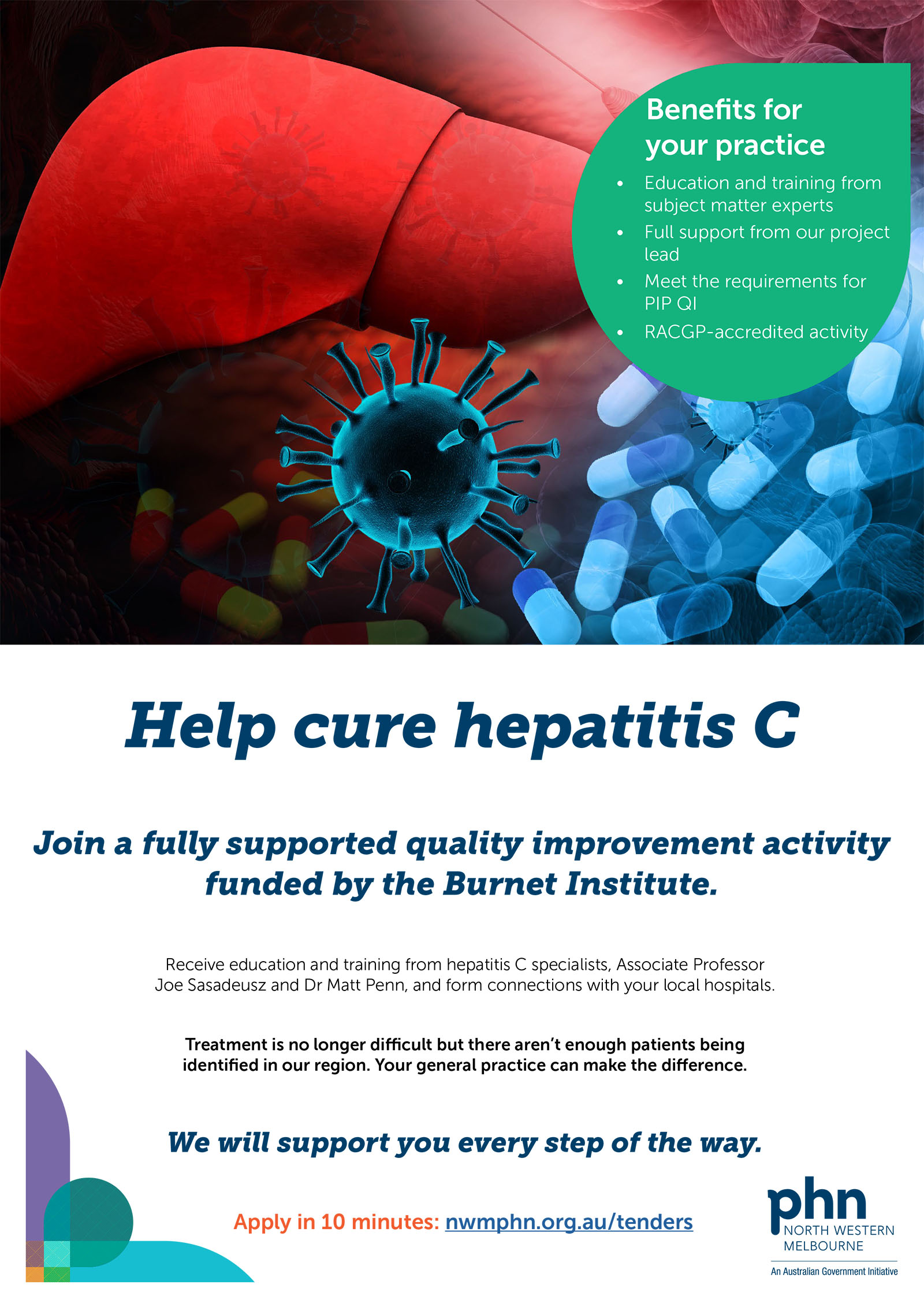 We are offering 10 practices an opportunity to participate in a supported, whole of practice, six-month Intensive Quality Improvement (IQI) activity. The aim of the activity is to increase the capacity and confidence of general practice to screen, treat and manage patients with hepatitis C.